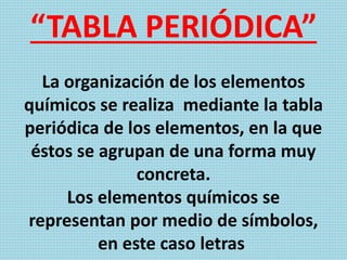 La tabla periódica ordena los elementos químicos de forma sistemática basada en sus propiedades periódicas. Los elementos se colocan en filas horizontales llamadas períodos y columnas verticales llamadas grupos, donde los elementos de un mismo grupo comparten propiedades químicas debido a su configuración electrónica. La tabla periódica actual consta de 118 elementos ordenados en 7 períodos y 18 grupos.