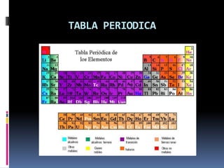 Este documento resume las propiedades periódicas de los elementos químicos según la tabla periódica propuesta por Mendeleev en 1869. Explica que las propiedades como el potencial de ionización, afinidad electrónica, electronegatividad, radio atómico y volumen atómico varían de forma periódica y regular a medida que los elementos se ordenan en la tabla. Luego define y describe cada una de estas propiedades periódicas.