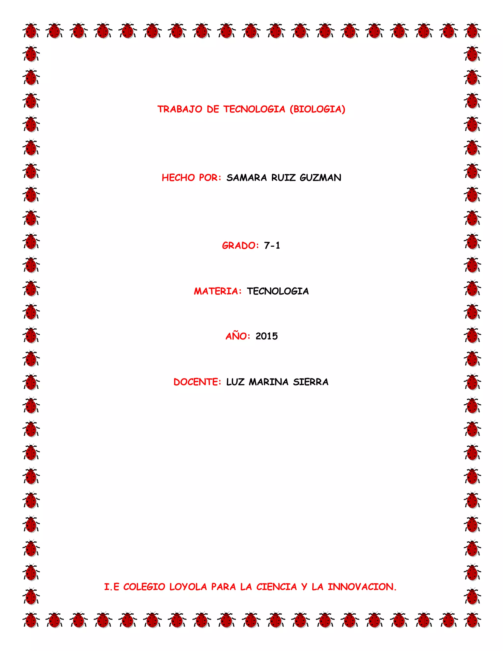 Este documento presenta un trabajo de tecnología realizado por Samara Ruiz Guzmán sobre diferentes tablas y gráficas que muestran datos sobre el consumo de yogurt, pizzas, celulares, cucharas, computadores y esmalte. El trabajo fue realizado para la materia de tecnología del grado 7-1 del Colegio Loyola para la Ciencia y la Innovación en el año 2015 bajo la guía de la docente Luz Marina Sierra.