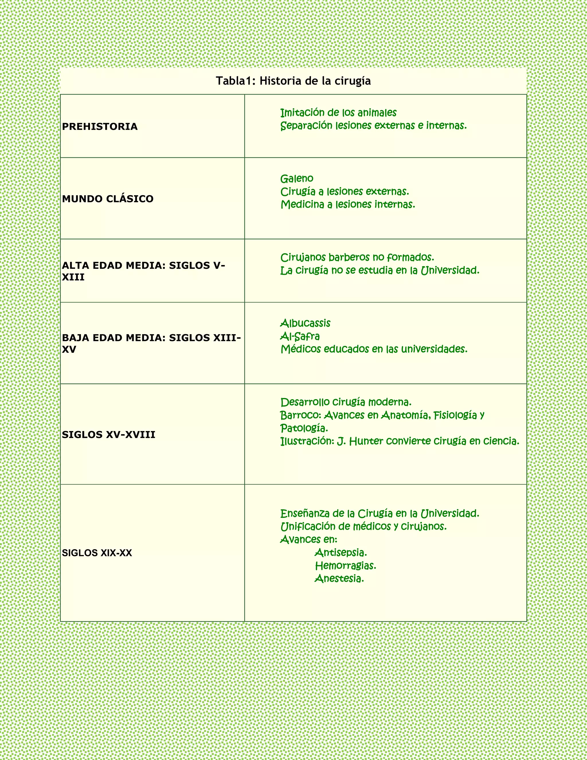 La tabla resume la historia de la cirugía desde la prehistoria hasta los siglos XIX-XX, cuando los cirujanos recibían educación universitaria, se unificaron con los médicos y hubo avances como la antisepsia, el control de hemorragias y la anestesia. La cirugía evolucionó de imitar a los animales y tratar lesiones externas en la prehistoria, a ser estudiada como ciencia en la universidad y aplicarse a lesiones internas y externas en la época clásica y la baja edad media.