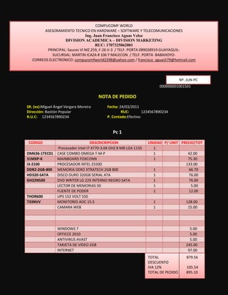 Este documento es una nota de pedido para 5 computadoras personales con especificaciones y precios detallados emitida por la compañía COMPUCOMF WORLD el 24 de marzo de 2011.