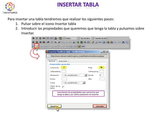 El documento detalla los pasos para insertar, modificar y eliminar filas y columnas en una tabla, así como para fusionar y dividir celdas. También explica cómo establecer la visibilidad de las líneas de la tabla y la función de regla horizontal para organizar el contenido. Se proporciona un conjunto claro de instrucciones para cada acción en la gestión de tablas.