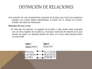 En Access se denomina objeto a cualquier cosa o elemento sobre los que actúa la aplicación. Los objetos principales de una base de datos de Access son tablas, consultas, informes, formularios, macros y módulos, los cuales constituyen el conjunto de la base de datos. Las tablas almacenan los datos en filas y columnas, las consultas recuperan datos específicos, los informes resumen y presentan la información, y los formularios permiten ver, editar y trabajar con los datos de las tablas.