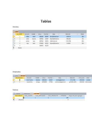 Este documento parece ser una lista de clientes, empleados y facturas para una compañía que ofrece servicios. Contiene los nombres de clientes y empleados así como detalles sobre facturas y los servicios que la compañía provee.