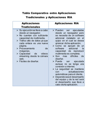 El documento presenta una comparación entre aplicaciones tradicionales y RIA, destacando la mayor capacidad multimedia y diseño complejo de estas últimas, así como su ejecución desde navegadores con o sin software adicional. También se establece una diferencia entre la web 1.0, caracterizada por páginas estáticas y falta de interactividad, y la web 2.0, que permite dinámicas como blogs, redes sociales y almacenamiento en la nube. En resumen, el avance hacia la web 2.0 ha transformado la interacción y creación de contenido en línea.