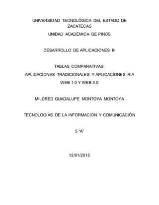 Este documento compara las aplicaciones tradicionales y las aplicaciones RIA (Rich Internet Applications), así como la Web 1.0 y la Web 2.0. Se describen las diferencias en capacidades multimedia, procesamiento de imágenes, recarga de páginas, navegación, uso de webcam y captura de video, dinámica de interacción, actualizaciones y tipo de software entre estas tecnologías web tradicionales y modernas. Adicionalmente, contrasta el enfoque de información centralizada versus descentralizada.