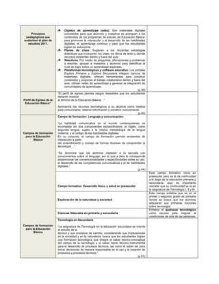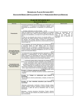 El documento describe el Plan de Estudios 2011 para la Educación Básica en México, el cual enfatiza el desarrollo de habilidades digitales e incorpora las tecnologías de la información y la comunicación. Se propone actualizar la escuela pública mediante el uso de plataformas digitales, materiales educativos multimedia, y el trabajo colaborativo en entornos virtuales. Los estándares curriculares de habilidades digitales se organizan en seis campos y buscan formar estudiantes competentes en el uso de las TIC.