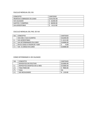 El documento resume los cálculos de impuestos sobre la renta (ISR), impuesto empresarial a tasa única (IETU), impuesto al valor agregado (IVA) e impuesto diario sobre efectivo (IDE) para una empresa en México. Calcula las bases imponibles, deducciones permitidas, tasas aplicables y montos a pagar para cada impuesto correspondiente al mes de junio.
