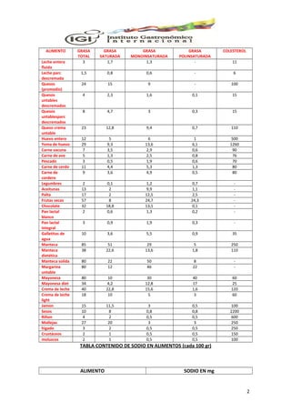 El documento presenta tablas con el contenido de fibra, ácidos grasos, colesterol y sodio de diversos alimentos. La tabla de fibra detalla la cantidad de gramos de fibra por cada 100 gramos de diferentes alimentos, siendo el salvado de trigo el que mayor contenido tiene con 42,5 gramos. Las tablas de ácidos grasos, colesterol y sodio especifican la composición nutricional de 100 gramos de varios productos alimenticios.
