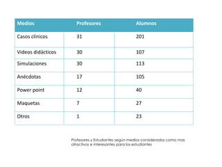 Este documento presenta los resultados de una encuesta realizada a profesores y estudiantes sobre los medios que consideran más atractivos e interesantes para los estudiantes. Los casos clínicos, videos didácticos y simulaciones fueron considerados los más efectivos por los estudiantes, mientras que los profesores prefirieron el uso de power point. El documento también incluye consejos para evitar errores comunes en la creación de diapositivas, como incluir demasiada información, usar imágenes de mala calidad o texto pequeño, y falta de preparación