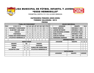El documento presenta las tablas de posiciones y resultados de la primera fecha de varias categorías en la Liga Municipal de Fútbol Infantil y Juvenil “Oxxo Hermosillo”. En la categoría Cachorros (2007-2008), el Atlético Hermosillo lidera luego de ganarle 5-0 al Manchester. En la categoría Peques (2005-2006), Esparza y Asociados es el líder luego de dos victorias. En Mini-Infantil (2003-2004), el Club Deportivo San Juan y los Talentos Oxxo 2005 son los líderes con dos