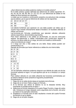 Este documento proporciona instrucciones sobre cómo usar tablas en Microsoft Word. Explica que las tablas se componen de filas y columnas que definen celdas, y que pueden usarse para organizar y presentar información u obtener cálculos. Luego detalla cómo insertar tablas, hacer referencias a celdas individuales y rangos, y usar funciones como promedio para realizar cálculos en tablas. También cubre el uso de marcadores para vincular datos entre tablas.