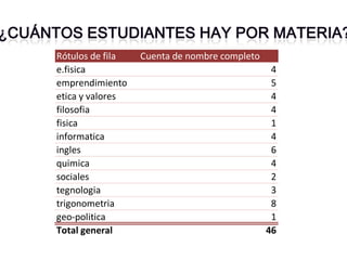El documento presenta tres tablas con datos numéricos. La primera tabla muestra el recuento de nombres completos por rótulo de fila, con un total general de 48. La segunda tabla presenta el recuento de asignaturas por rótulo de fila, con un total de 46. La tercera tabla vuelve a mostrar el recuento de nombres completos por rótulo de fila, con un total general también de 48.