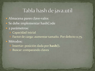 Este documento describe las tablas hash y su funcionamiento. Las tablas hash almacenan pares clave-valor y requieren implementar hashCode para las claves. Su capacidad inicial y factor de carga determinan cuándo aumentar su tamaño. Los métodos incluyen insertar usando hash() y buscar comparando claves. Las claves pueden ser cadenas u otros tipos, requiriendo una clase contenedora. La función de dispersión asigna una posición en la tabla según la clave usando operadores como el módulo o sumas de códigos ASCII