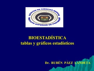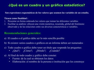 1) El documento habla sobre tablas y gráficos estadísticos, que son expresiones esquemáticas de los valores de variables de un estudio. 2) Sirven para presentar de forma ordenada los valores de las variables y facilitar su análisis, ofreciendo una visión numérica y global del fenómeno observado. 3) Describe diferentes tipos de tablas y gráficos para variables cualitativas y cuantitativas.