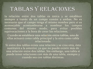 Entre dos tablas solo puede existir una relación establecida a través de un campo común. Existen tres tipos de relaciones: uno a uno, uno a varios y varios a varios. La relación uno a uno vincula un registro de cada tabla, mientras que la relación uno a varios vincula un registro principal con varios registros relacionados y es el tipo más común.