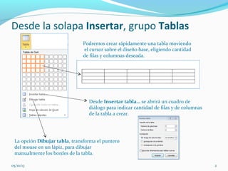 Este documento describe diferentes formas de crear y modificar tablas en Microsoft Word, incluyendo dibujar tablas manualmente, insertar tablas a través de un cuadro de diálogo, usar las herramientas de diseño y presentación de tablas, e insertar fórmulas como promedios y sumas en celdas de tabla.