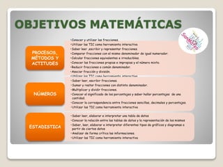 El documento presenta los objetivos y contenidos de una unidad didáctica sobre matemáticas y lengua castellana. En matemáticas, los objetivos son conocer las fracciones, tablas de datos y porcentajes. Los contenidos incluyen operaciones con fracciones, porcentajes y gráficos. En lengua castellana, los objetivos son mejorar la comunicación oral y escrita y conocer diferentes tipos de textos. Los contenidos tratan sobre entrevistas, cartas y reglas ortográficas.