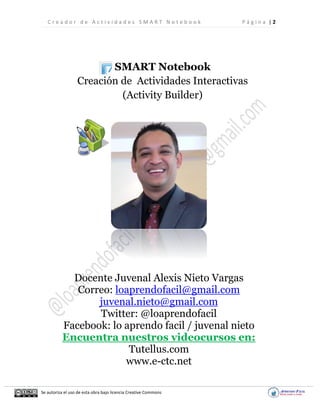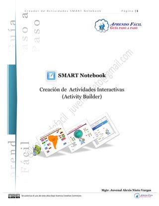 Este documento presenta un manual para crear actividades interactivas utilizando el complemento Creador de Actividades de SMART Notebook. Inicialmente se muestra un ejemplo de actividad sobre palabras agudas y luego se explica paso a paso cómo construir esta actividad, insertando texto, imágenes y configurando el comportamiento del objeto recipiente. Finalmente, se proponen retos adicionales para validar los conocimientos sobre el uso del Creador de Actividades.