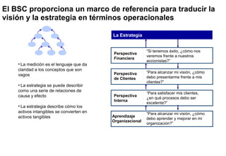 El documento habla sobre los tableros de comando o balanced scorecard. Explica que son herramientas que permiten traducir la estrategia de una empresa en indicadores medibles. Menciona que miden el desempeño desde cuatro perspectivas: financiera, clientes, procesos internos y aprendizaje/crecimiento. El balanced scorecard ayuda a las empresas a gestionar su desempeño y avanzar hacia sus objetivos estratégicos.