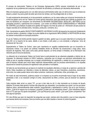 El documento habla sobre la importancia de los tableros de control para mejorar la administración y gestión de las empresas agropecuarias. Explica que los tableros de control son herramientas que proveen información clave a través de indicadores financieros y operativos de manera sencilla para apoyar la toma de decisiones. Implementar tableros de control genera beneficios como una revisión sistemática de los procesos de la empresa y resultados consolidados que sintetizan el estado de la gestión para reducir riesgos. El documento también discute