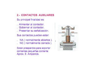 Este documento describe los interruptores termomagnéticos, sus características, normas, componentes internos y curvas de operación. Explica que su objetivo principal es proteger los conductores eléctricos de sobrecorrientes y cortocircuitos mediante protecciones térmica y magnética. También cubre interruptores diferenciales y sus características.