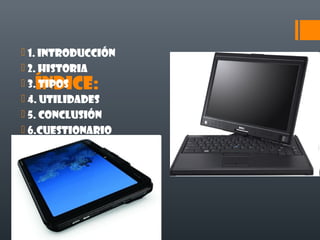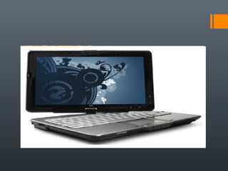 Este documento describe los tablet PC, incluyendo su historia, tipos y utilidades. Los tablet PC son computadoras personales portátiles con pantallas táctiles que permiten interactuar sin teclado o ratón. Su historia se remonta a 1989 cuando se lanzó el primer tablet, aunque no fue hasta 2001 que Microsoft impulsó su desarrollo. Hoy en día existen dos tipos principales de tablet, unos con pantalla táctil sola y otros con teclado integrado. Sus utilidades incluyen leer libros y cómics, navegar la web, j