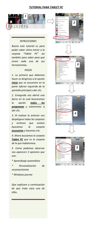 Este documento proporciona instrucciones para acceder a la carpeta "Tablet PC" y explica las herramientas que contiene. Explica los 5 pasos para encontrar la carpeta "Tablet PC" en el menú inicio. Luego describe las 3 opciones dentro de esta carpeta: "Aprendizaje automático", que mejora el reconocimiento de escritura con el uso, "Personalización de reconocimiento", que permite personalizar el idioma y estilo, y "Windows journal", una aplicación para crear y organizar notas manuscritas.