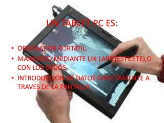 Un tablet PC es un ordenador portátil que se maneja mediante un lápiz óptico o los dedos y permite introducir datos directamente en la pantalla táctil. Existen varios tipos como convertibles con teclado, slate sin teclado, e híbridos que combinan ambas características. Los tablet PC incluyen componentes como altavoces, disco duro, memoria RAM y batería, y se conectan a Internet a través de WiFi o Bluetooth.