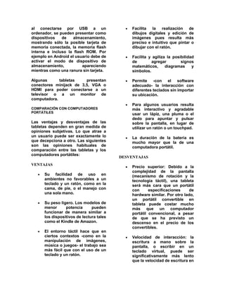 Una tableta es un dispositivo portátil más grande que un teléfono pero más pequeño que una computadora, que se interactúa principalmente con los dedos a través de una pantalla táctil. Si bien el concepto se originó en la década de 1970, las tabletas modernas se hicieron populares a partir del lanzamiento del iPad en 2010. Actualmente, muchas compañías producen tabletas que varían en tamaño, aplicaciones y sistemas operativos.