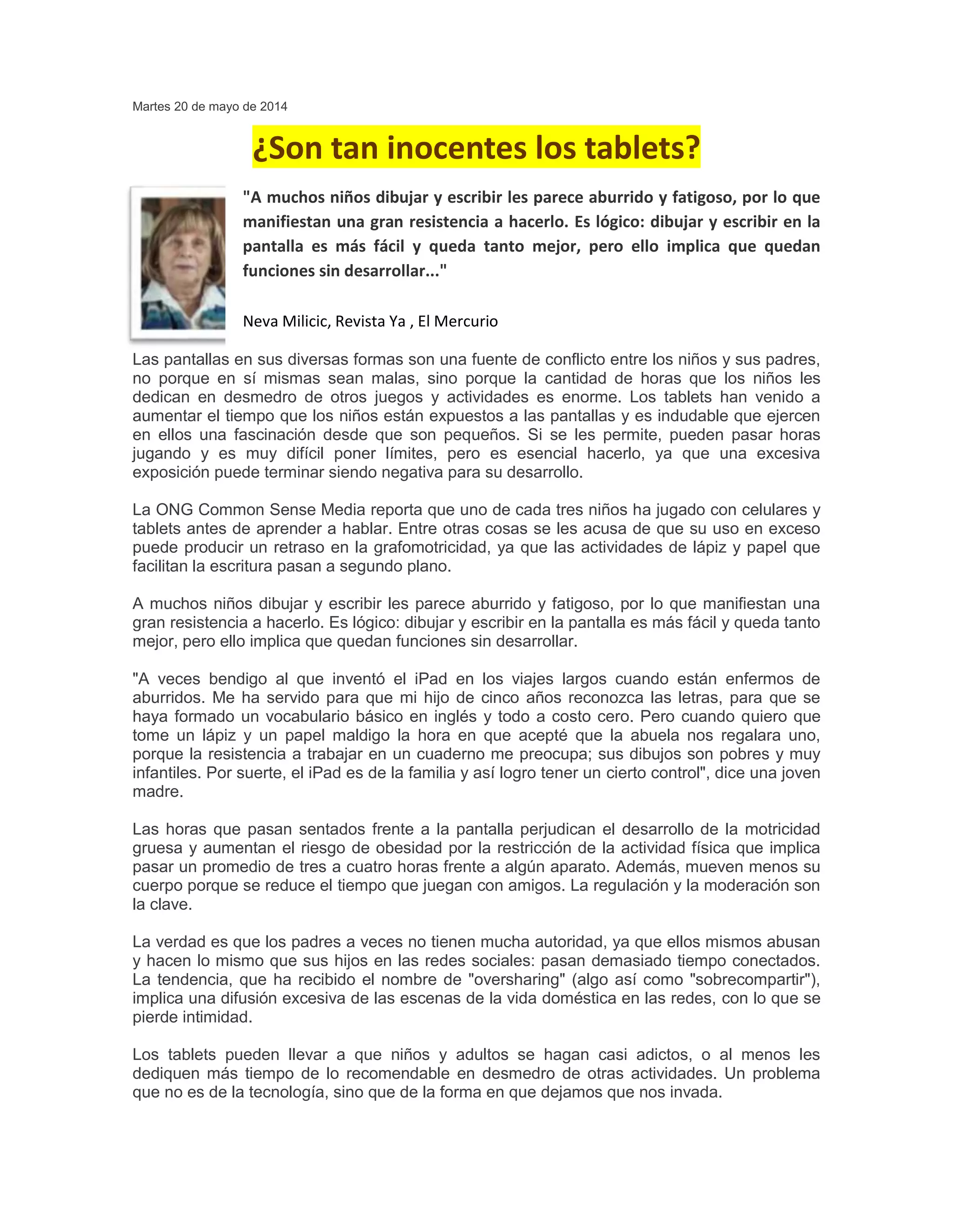 El documento discute los efectos potencialmente negativos del uso excesivo de tablets y pantallas por parte de los niños. Señala que el uso prolongado puede retrasar el desarrollo de habilidades como la escritura a mano y dibujo, así como aumentar el riesgo de obesidad. También menciona que es importante que los padres pongan límites al tiempo que los niños pasan frente a las pantallas y fomenten otras actividades para un desarrollo saludable.