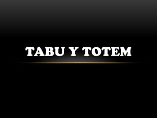 El documento explica el significado de tabú y totem. Tabú se refiere a conductas prohibidas por razones culturales, sociales, morales o religiosas, como la sexualidad y el suicidio. Tótem es el símbolo de una tribu, clan o individuo que representa algo religioso y mágico usado como elemento social. La Iglesia Católica se relaciona con ambos conceptos ya que prohíbe ciertas conductas y adora imágenes como Jesucristo y la Virgen, al igual que otras culturas con sus tótems.