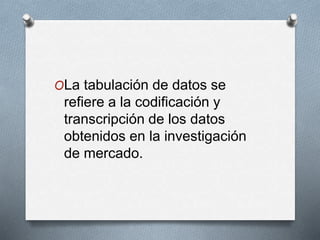 La tabulación de datos se refiere al proceso de codificar y transcribir datos de investigaciones de mercado. Este proceso implica contar y organizar datos de cuestionarios en tablas y gráficos para analizar las relaciones entre variables estudiadas, como se muestra en un ejemplo de una encuesta a 150 tiendas sobre sus problemas, contabilidad y razones para la compra de clientes.