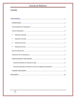 Este documento explica cómo utilizar los tabuladores en Microsoft Word. Detalla los tipos de tabuladores disponibles (izquierda, centrada, derecha y decimal), cómo configurarlos utilizando la regla o el cuadro de diálogo de tabulaciones, y cómo eliminarlos. Además, describe la función de los tabuladores y su utilidad para alinear texto en una página.