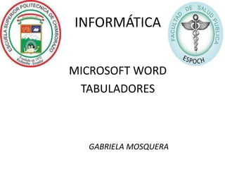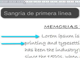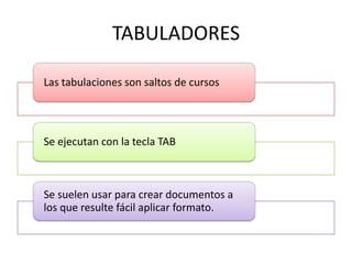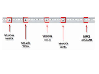 Este documento describe las tabulaciones y sangrías en Microsoft Word. Explica que las tabulaciones se usan para crear saltos de línea y se ejecutan con la tecla TAB. Describe cuatro clases de tabulaciones: izquierda, centrar, derecha y decimal. También define las sangrías como los espacios entre el párrafo y el margen, y que se pueden aumentar o disminuir.