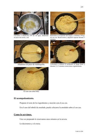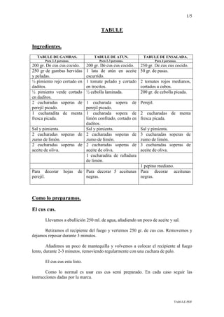 Este documento presenta recetas para tres variantes del plato tabulé: de gambas, de atún y de ensalada. Cada receta incluye una lista de ingredientes y una breve descripción de los pasos de preparación. También se ofrecen algunas consideraciones sobre cada variante, como usar gambas frescas en el tabulé de gambas y atún en abundancia en el de atún. El objetivo es proporcionar información sobre los ingredientes y métodos básicos para preparar estas tres versiones del plato tabulé.