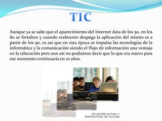 El documento describe la evolución del uso de las tecnologías de la información y la comunicación (TIC) en la educación, desde la introducción de las nuevas tecnologías educativas (NNTT) en las escuelas y colegios hasta el desarrollo de Internet y las TIC en los años 90 y su aplicación en la educación. También explica cómo el papel del profesor ha cambiado a ser un mediador y guía del aprendizaje de los estudiantes, usando técnicas de aprendizaje colaborativo (TAC) apoyadas por las
