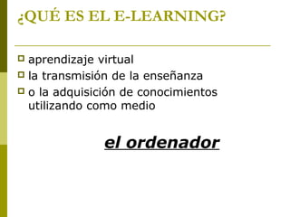 El documento proporciona una introducción al e-learning, describiendo su enfoque en la función del docente y el uso combinado de métodos de enseñanza tradicionales y digitales. También describe varias herramientas útiles para la comunicación y creación de contenidos para el e-learning, como blogs, wikis, YouTube y podcasts. Finalmente, discute conceptos como objetos de aprendizaje digitales, derechos de autor y comunidades virtuales.