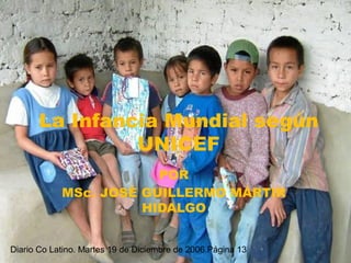 El documento aborda la difícil situación de millones de niños y niñas en el mundo, quienes sufren exclusión social, maltrato y abuso en contextos de pobreza y conflictos. Destaca la necesidad de un enfoque basado en derechos humanos para erradicar la pobreza extrema y mejorar sus condiciones de vida, a través de la asignación de recursos a educación y salud. Además, se enfatiza la importancia de la prevención del maltrato infantil y el apoyo psicológico para las víctimas de abuso, así como la responsabilidad social de todos los sectores para garantizar el bienestar infantil.