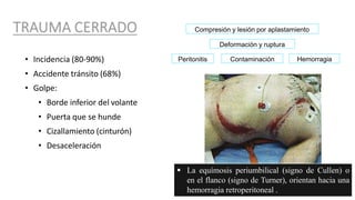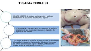 El documento describe diferentes tipos de lesiones por trauma abdominal cerrado como impacto directo, lesiones por cizallamiento y lesiones por desaceleración. Explica cómo se producen y evalúan estas lesiones a través de exámenes físicos, lavado peritoneal diagnóstico, ecografía focalizada en trauma y tomografía axial computarizada. También detalla el manejo y tratamiento de lesiones específicas como las del páncreas e intestino delgado.