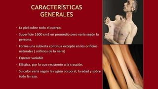 El sentido del tacto se encuentra principalmente en la piel, donde existen diferentes tipos de receptores nerviosos que transforman los estímulos externos en información para el cerebro. La piel está compuesta de la epidermis, dermis e hipodermis, y contiene siete tipos de corpúsculos que perciben sensaciones como la presión, temperatura, dolor y textura. El tacto es esencial para la supervivencia humana y nos permite interactuar con nuestro entorno.