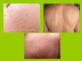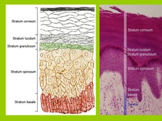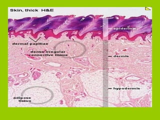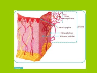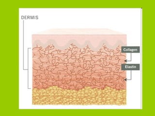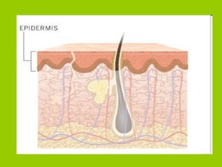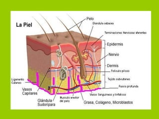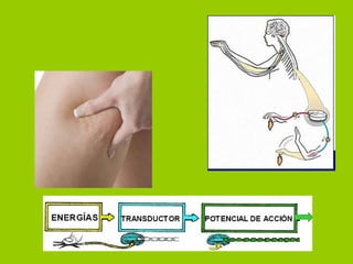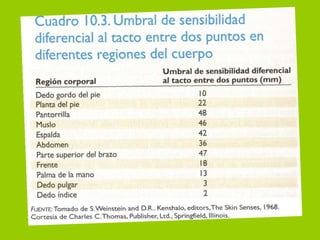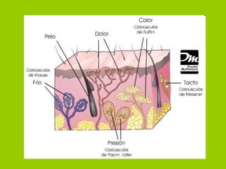 El documento describe los diferentes tipos de receptores cutáneos involucrados en el sentido del tacto y la percepción de estímulos, incluyendo mecanorreceptores, termorreceptores y quimiorreceptores. Explica que estos receptores se encuentran en la dermis y envían señales al cerebro a través de las vías nerviosas. También aborda conceptos como la nocicepción, el dolor agudo y crónico, y algunos aspectos socioculturales relacionados con el tacto.