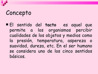 El tacto es el sentido que permite percibir cualidades físicas de los objetos a través de la piel. La piel contiene diferentes tipos de receptores nerviosos especializados que detectan presión, temperatura, dolor y otras sensaciones y envían esta información al cerebro. Los principales receptores táctiles son los corpúsculos de Merkel, Meissner, Ruffini, Krause y Pacini, cada uno especializado en detectar un tipo diferente de estímulo.