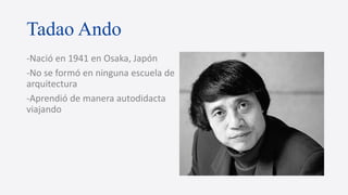 Tadao Ando, nacido en 1941 en Osaka, Japón, es un arquitecto autodidacta reconocido por su enfoque en la arquitectura minimalista que integra la naturaleza, destacando el uso del agua y la luz. Su obra combina tradición japonesa con modernidad, utilizando materiales como hormigón, piedra y madera. Entre sus proyectos más destacados se encuentran la Casa en Row del Sumiyoshi y la Iglesia de la Luz.