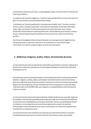 Este documento presenta información sobre herramientas para la creación y publicación de contenidos didácticos digitales. Menciona algunas herramientas como ContentGenerator, Mystudiyoo, QuizRevolution, Hot Potatoes, JClic y eXeLearning. Describe brevemente las características y usos de estas herramientas, que permiten a los profesores crear materiales educativos multimedia de forma sencilla para ser utilizados en clases presenciales o a distancia.