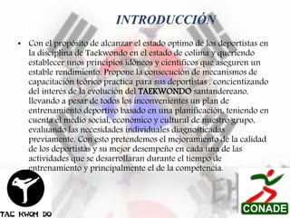 Este documento presenta un plan de entrenamiento de Taekwondo dirigido por Uriel García Sandoval y Daniel Godínez Álvarez. El plan busca mejorar el rendimiento de los deportistas a través de objetivos como fortalecer sus habilidades técnicas, tácticas, físicas y psicológicas. El plan incluye varias estrategias de entrenamiento como desarrollar resistencia, velocidad y fuerza, así como trabajos técnicos específicos del Taekwondo.