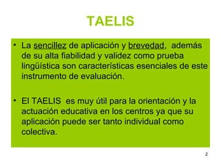 El TAELIS es una prueba de evaluación del nivel de inglés para estudiantes de entre 11 y 17 años. La prueba se puede aplicar de forma individual o colectiva y toma aproximadamente 45 minutos. Evalúa las habilidades de lectura, escritura, comprensión auditiva y expresión oral a través de preguntas en un cuadernillo y estímulos auditivos en un CD. Los resultados proporcionan la puntuación global y por secciones, así como el nivel relativo y absoluto del estudiante.