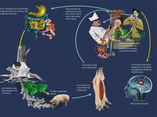 El documento describe el parásito Taenia solium, conocido como lombriz solitaria, que vive en el intestino delgado de los humanos y causa teniasis y cisticercosis. Se detallan sus características morfológicas, ciclo de vida, modo de infección, y métodos de prevención y tratamiento. El tratamiento efectivo involucra el uso de fármacos como praziquantel y niclosamida.