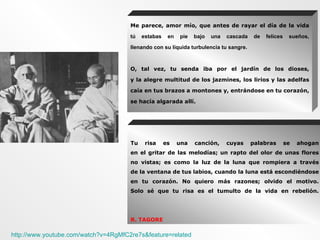 El poema describe la risa del amado como una canción ahogada por melodías, un rapto de olores de flores invisibles, y la luz de la luna rompiendo a través de sus labios. La risa es retratada como el tumulto de la vida en rebelión.