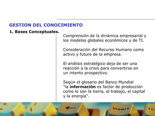 El documento habla sobre la gestión del conocimiento. Aborda conceptos como el capital intelectual, los mapas conceptuales y la inteligencia competitiva. Define el conocimiento, la competencia, la innovación y la ventaja competitiva como elementos clave para generar valor en las organizaciones. Explica que el capital intelectual incluye el capital humano, estructural y relacional de una empresa.